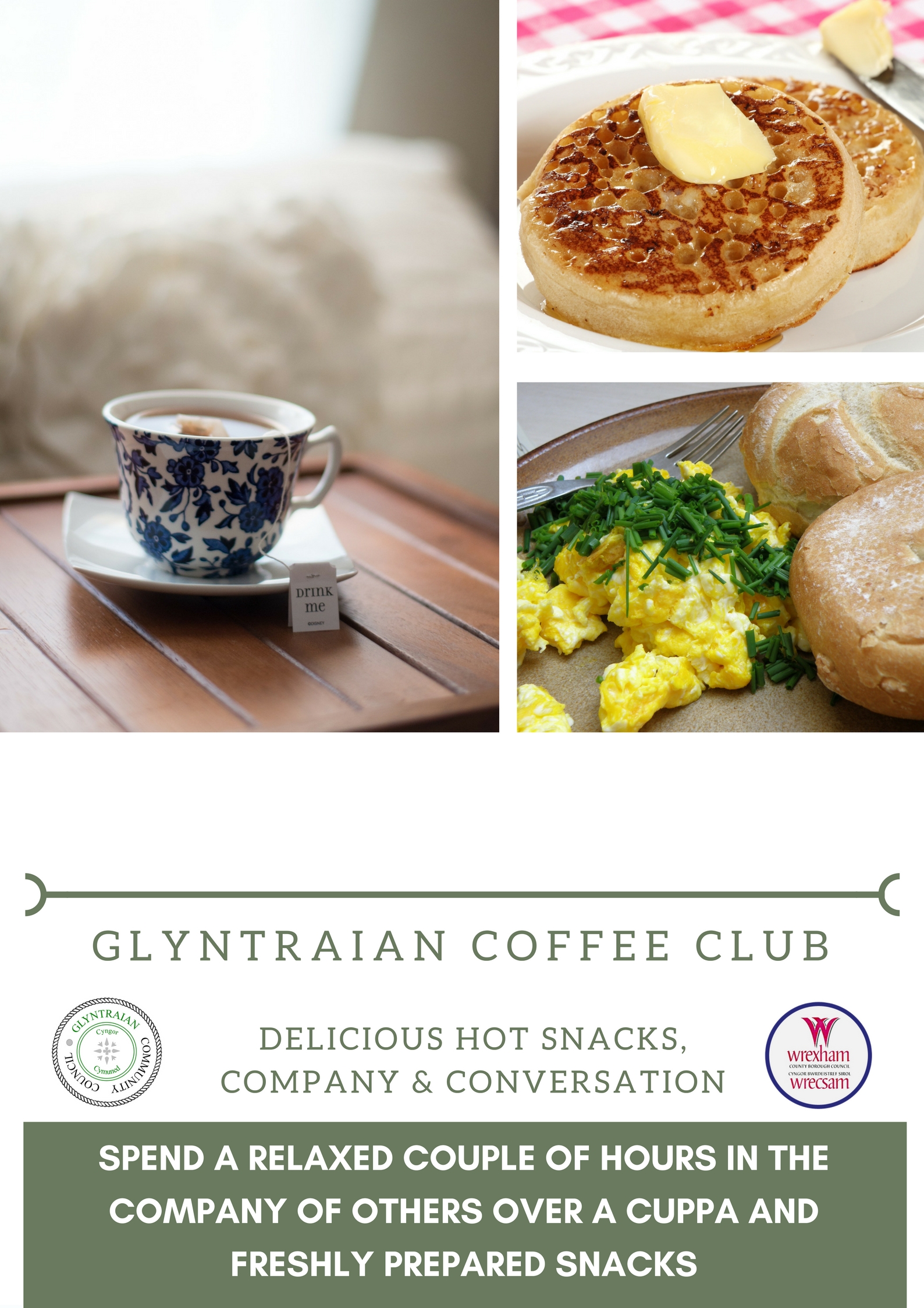 Glyntraian Community Council’s Community Agent, Davena Davies, can often be found at the Council’s inclusive Monday Coffee Club. The club runs from 10:00 – 12noon at the Oliver Jones Memorial Hall, Dolywern. It is a lovely, friendly club where you can connect with other members of the community and enjoy a delicious light breakfast or snack for just a modest donation towards the cost.